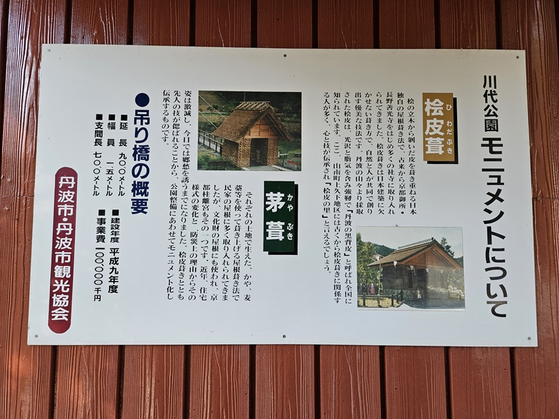 建物をくぐろうとしたら説明書きがあります。なかなかの長さの吊り橋ですね!