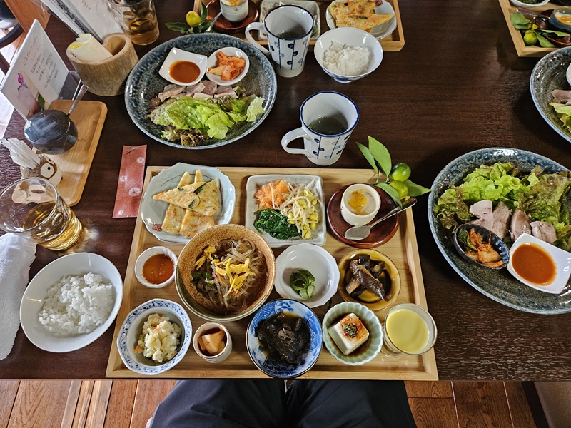 暖簾から入ります。「古民家和韓旬菜料理 きりん亭」さんの地元の旬菜ランチを堪能します。小鉢にいろんな料理があるのでこれまた楽しめます。とても美味しくて、会話も弾みます(^^)