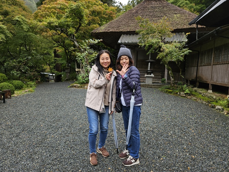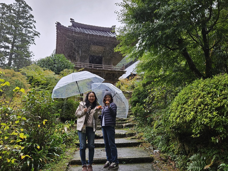 その先に行くと、岩瀧寺があります。茅葺屋根の本堂が歴史の重みを語っているようです。その前で記念撮影(^^)