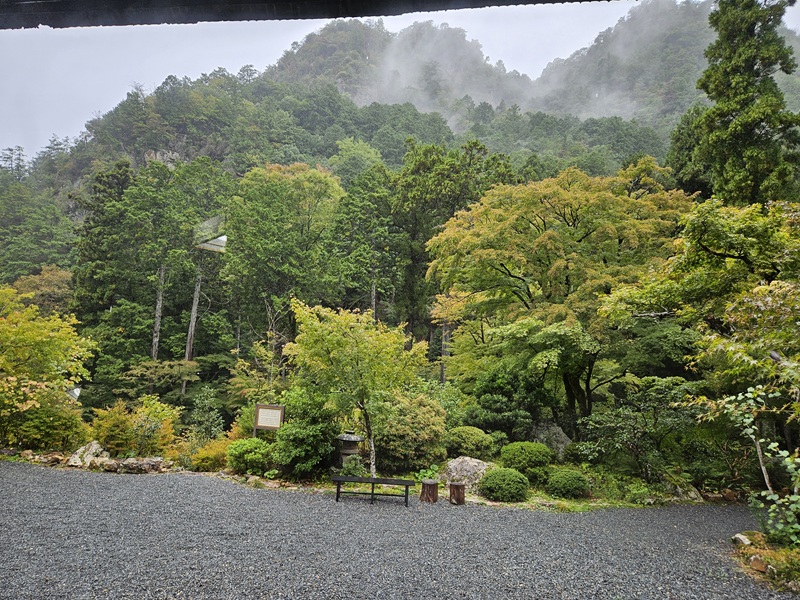 実演をしている縁側から外を見ると、少し紅葉している庭園と山並みがとても美しいです。心が洗われます。
