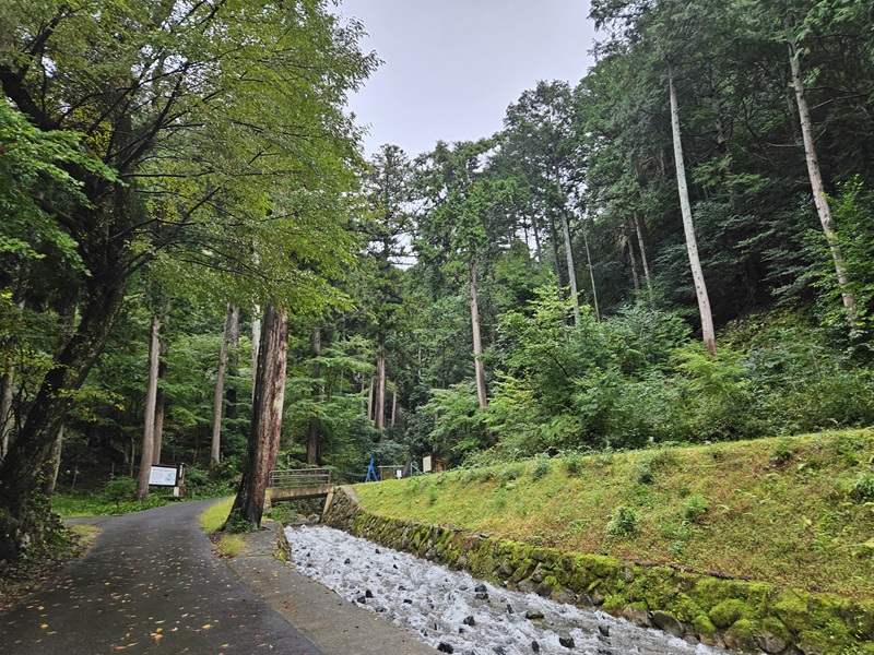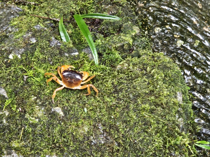 最初の場所、独鈷の滝に9:40に到着。滝を目指します。サワガニに歓迎されています(笑)。途中で川を背景に記念写真をパシャリ(^^)