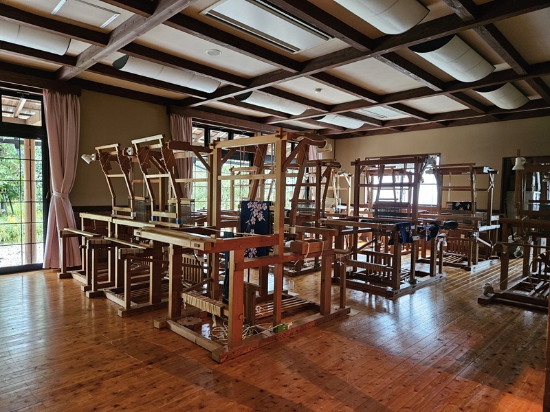 「道の駅 あおがき」の中に、丹波布伝承館があります。先ほど岩瀧寺でのおばあちゃんが言っていた丹波布を扱っていた所です。中に入ると展示されている昔の機織が置いてあったりして、僕も初めて入りましたがすごいです!丹波布でつくったグッズも買えます(^^)