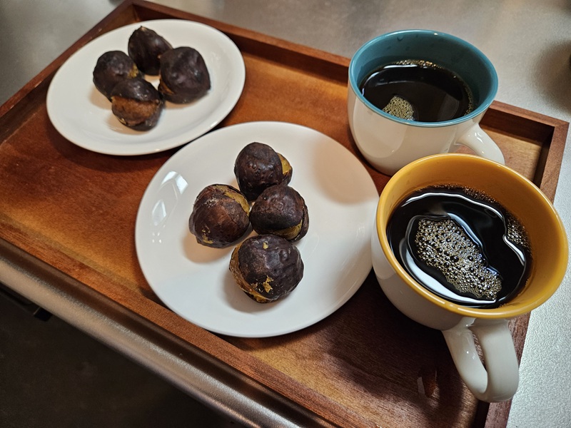 途中のブレイクタイムに自家ドリップ珈琲を淹れて、買ってきた丹波の焼き栗でおもてなし。喜んでもらえたのが嬉しいです(^^)
