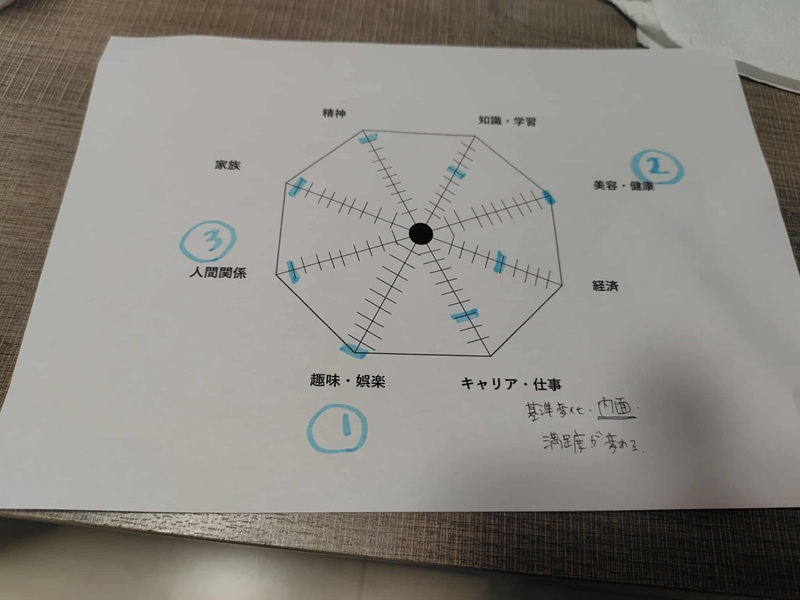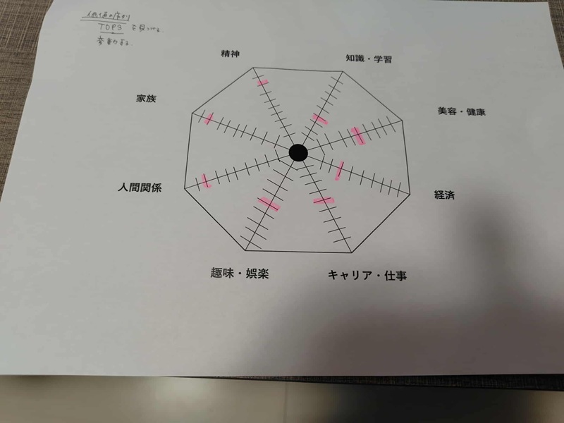 満足度を数値化した比較です!人生の8つの分野ごとに満足度を10点満点中何点か?しるしをつけてもらうのですが、左のピンクのマーカーの方は、最初の篠山口駅で合流した際に車で書いてもらった、ここ最近感じている満足度の点数です。