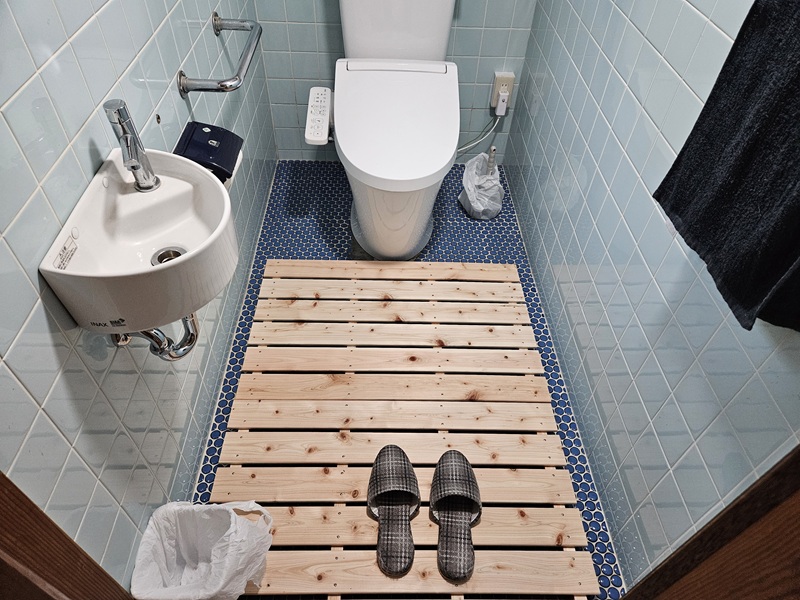 トイレも掃除。トイレはタイル張りの空間なので、温かみを出すために、すのこを敷いて木の感じを演出☆