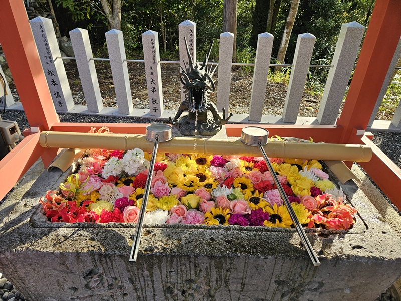 階段を上り切った所に龍の手水舎があります。たくさんのお花が浮いていてキレイです(^^)