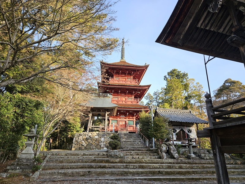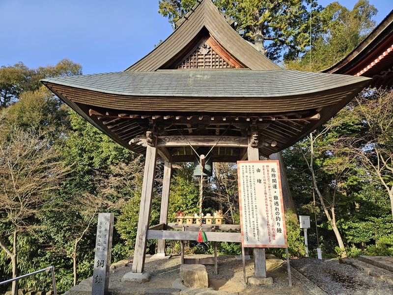 鳥居をくぐり本殿で参拝。奥に三重塔があり手前に鐘があります。3回着きました!最後に厄年なので、厄除神社の参拝。