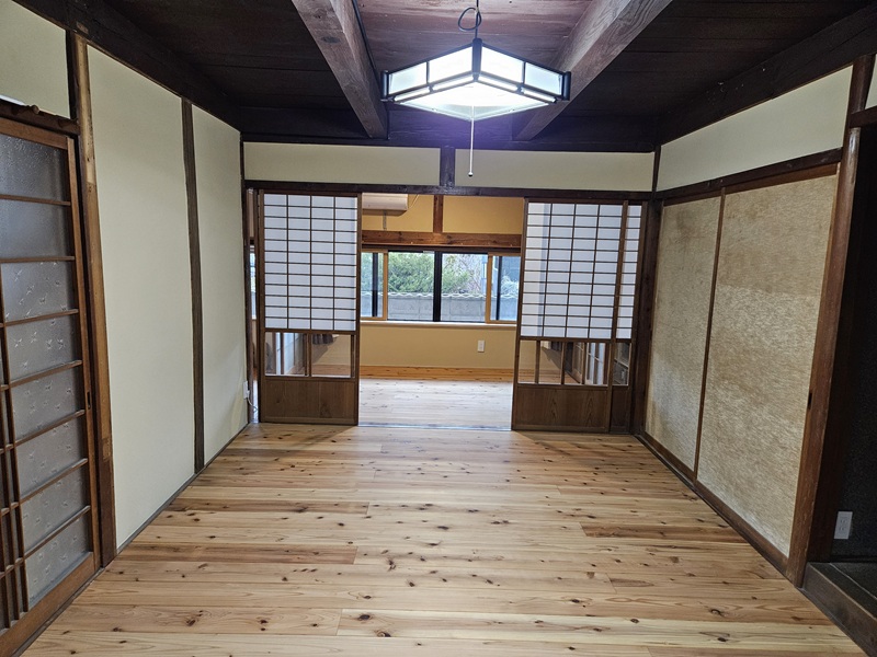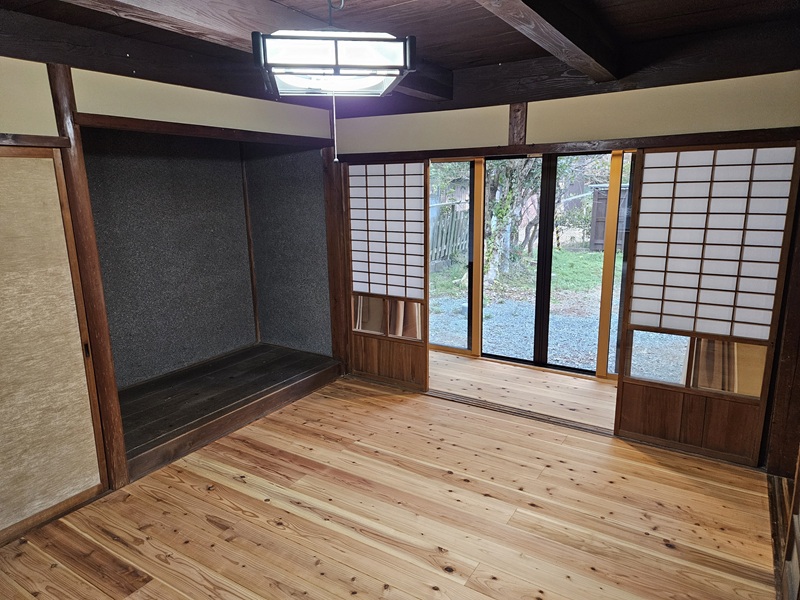1階の今は杉板のフローリングなのでほうきでほこりを掃きます。まだ、何も置いていないのでスッキリした空間です☆障子と板床は合いますね(^^)