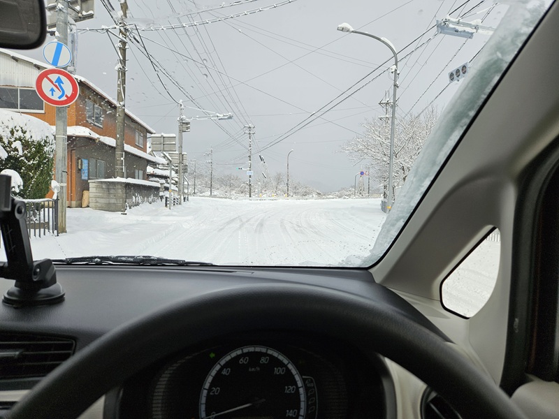 丹波市青垣町佐治で行われるサジイチに向かいます。雪は大分落ち着いてきています。初めての雪道走行はドキドキしました~。徐行運転です。