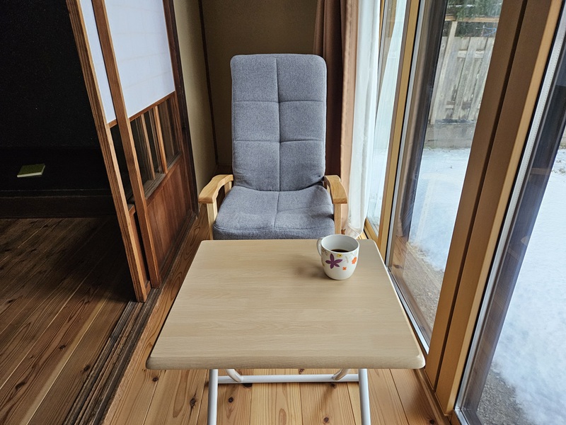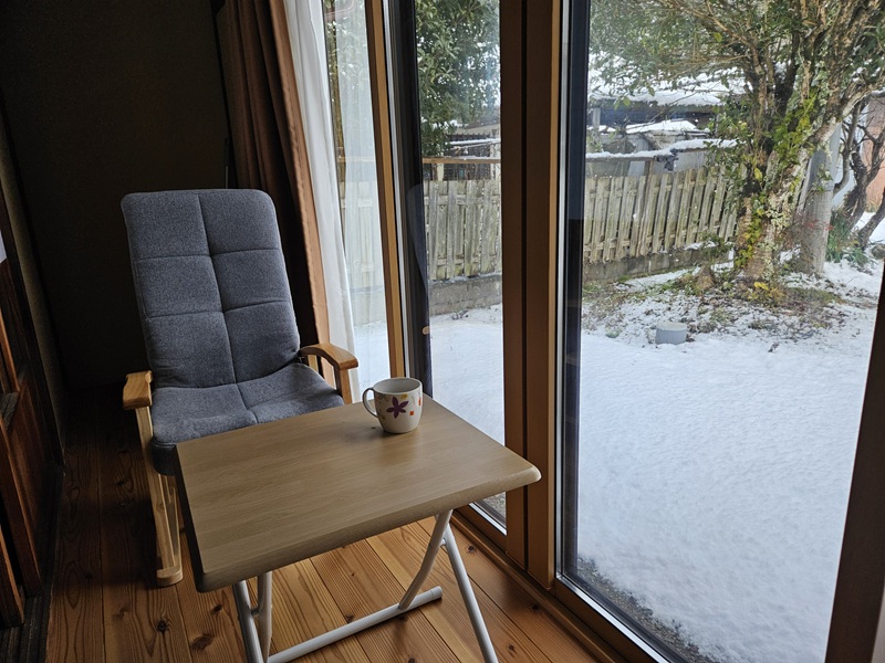 雪かきを終えてから、珈琲をいれて縁側でくつろぎます。雪見珈琲ですね☆