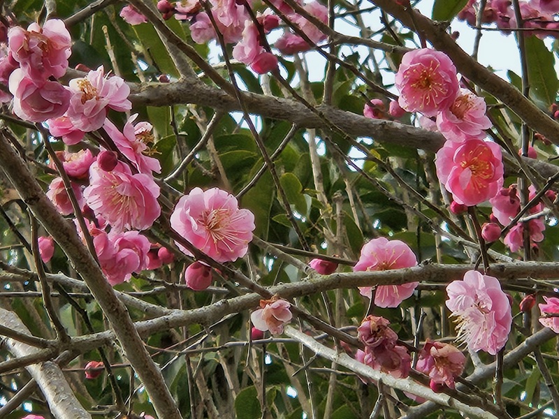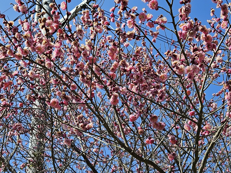 空に向かって、ピンク色の梅の花が拡がる光景に春の訪れを感じます。